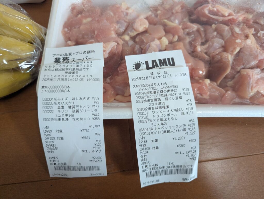 ラムーと業務スーパー合わせて3,130円でした!