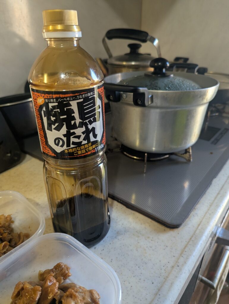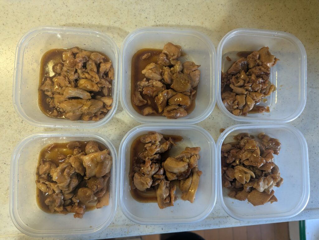 この鶏肉を使って、業務スーパーの鶏肉のタレ(1L入りで300円ほどです)をフライパンで合わせるだけで簡単に照り焼き風の鶏料理ができます。